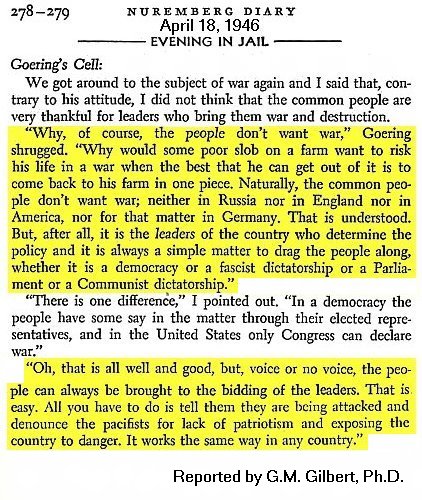Hermann Goering and George W. Bush's Advisors Was the attack on the World Trade Center an attack on the American people OR an attack on corporate America? If 9-11 was an attack on corporate America and NOT the American people, wouldn't that make the 'war on terrorism' a hoax? Read the following passage on how Hermann Goering, Hitler's right-hand man during World War II, explains how to drag the common people into war. ![]() Now ask yourself, 'Are the American people being misled by Bush's administration?'
